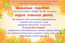 С 24 по 28 октября в МАДОУ № 401 прошла Неделя открытых дверей для родителей. Она была посвящена Году народного искусства и нематериального культурного наследия народов РФ