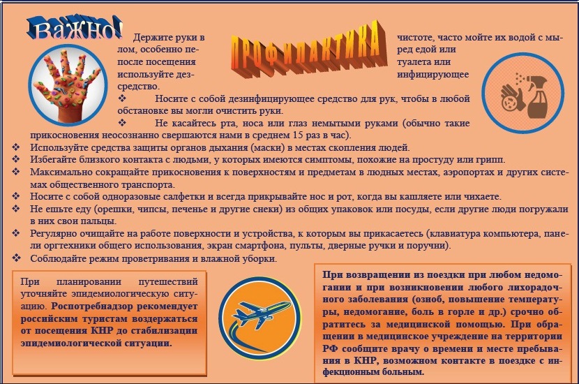 Индивидуальная профилактика гриппа, ОРВИ, в том числе коронавирусной инфекции СОУГО-19ПРАВИЛО 1. МОЕМ РУКИ• Мойте руки с мылом после посещения любых общественных мест, транспорта, прикосновений к дверным ручкам, деньгам, оргтехнике, перед едой и приготовлением пищи.• При отсутствии доступа к воде и мылу необходимо использовать дезинфицирующие средства или одноразовые влажные салфетки.• Не прикасайтесь к лицу и глазам немытыми руками.• Не пользуйтесь общими полотенцами.ПРАВИЛО 2. СОБЛЮДАЕМ ГИГИЕНУ РАБОЧЕГО МЕСТА И ПОМЕЩЕНИЙ• Убедитесь, что Ваше рабочее место гигиенично.• Для удаления вирусов с поверхности столов, стульев, дверных ручек, гаджетов, клавиатуры, мониторов, портфелей, сумок дезинфицируйте их, используя бытовые моющие средства (например, мыльный раствор).• Часто проветривайте помещения на работе и дома, проводите влажную уборку.ПРАВИЛО 3. СОБЛЮДАЕМ ОБЩУЮ ГИГИЕНУ.• Ежедневно принимайте душ, мойте волосы. Отдавайте предпочтение гладким прическам (распущенные волосы, часто контактируя с лицом, увеличивают риск инфицирования).• В течение дня 3-4 раза промывайте проточной водой лицо и носовые проходы.• Ограничьте приветственные рукопожатия, поцелуи и объятия.• На работе принимайте пищу только в специально отведенных местах.ПРАВИЛО 4. ЗАЩИЩАЕМ ОРГАНЫ ДЫХАНИЯ С ПОМОЩЬЮ МЕДИЦИНСКОЙ МАСКИ.• Медицинские маски используются при посещении мест массового скопления людей, поездках в общественном транспорте, при уходе за больными и при общении с лицами с острыми респираторными вирусными инфекциями.• Чтобы обезопасить себя от заражения, важно правильно носить маску:- маска должна тщательно закрепляться, плотно закрывать рот и нос, не оставляя зазоров;- влажную или отсыревшую маску следует сменить на новую;- маски следует менять каждые 2 часа;- при снятии старайтесь не касаться поверхностей маски руками;- использованная маска должна утилизироваться в мусорный контейнер;- не используйте вторично одноразовую маску.• В случае отсутствия одноразовой маски, ее можно сшить несколько в домашних условиях из 4 слоев марли.• При уходе за больным, после окончания контакта, маску следует немедленно снять и тщательно вымыть руки.• Не рекомендуется использование маски на открытом воздухе.• При чихании и кашле использованный тканевый носовой платок необходимо сразу менять, стирать ежедневно и проглаживать с обеих сторон. При возможности желательно использовать бумажные носовые платки.ПРАВИЛО 5. ЧТО ДЕЛАЕМ ПРИ ПОЯВЛЕНИИ ПЕРВЫХ СИМПТОМОВ (высокая температура тела, озноб, головная боль, слабость, заложенность носа, кашель, затрудненное дыхание)• Ограничьте контакты.• Останьтесь дома и обратитесь в лечебное учреждение за медицинской помощью.• Используйте для еды и питья индивидуальную посуду и мойте ее индивидуальной губкой с моющими средствами.ПРАВИЛО 6. ПРИ ВЫЕЗДАХ В КОМАНДИРОВКУ ИЛИ НА ОТДЫХВоздержитесь от поездок в зону риска по распространению вирусной инфекции, в том числе коронавирусной СОУГО-19.В случае выезда информируйте работодателя о стране, которую планируете посетить и сроках.В случае посещения страны зоны риска воздержитесь от контактов в течение 14 дней после возвращения.