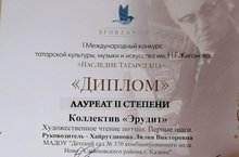 15 марта состоялся I Международный конкурс татарской культуры, музыки и Искусства им. Н.Г.Жиганова «Наследие Татарстана». Наши воспитанники заняли призовое 2 место.Поздравляем! МОЛОДЦЫ!!! Воспитатель- Гатаулина И.Е. Руководитель- Хайрутдинова Л.В.