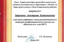 Воспитатель Забродина Анастасия Владимировна в ноябре- декабре 2016 принимала участие в районном конкурсе " Воспитатель года" и награждена Грамотой отдела Управления образования ИКМО г. Казани по Авиастроительному и Ново- Савиновскому районам.