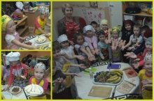 10 нчы зурлар төркемендә "Җиләк-җимеш" проекты узды. Фотода йомгаклау чарасы - балалар матур пешекче костюмнарын киеп,тәрбичсе Александрова Ирина Васильевна белән җиләк-җимеш салаты ясарга өйрәнәләр!