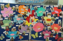 Творческая группа детского сада сделала вот такой подарок всем коллегам: на цветах фотографии всех сотрудниц детского сада и стихотворение о каждой!