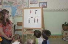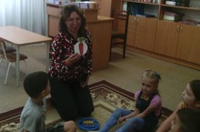 На фоторгафии воспитатель средней группы № 12 Елена Владимировна Федотова со своими воспитанниками играет дидактическую игру "Бу кем?" -"Кто это?". ( с элементами УМК по обучению двум государственым языкам)