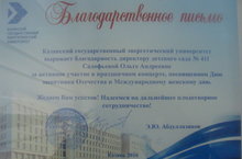Благодарственное письмо от ректора Казанского государственного энергетического университета Абдуллазянова Э.Ю. - заведующей МАДОУ Садофьевой Ольге Андреевне и воспитанникам ДОУ!