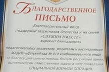 В марте 2026 г. в детском саду прошли акции «Письмо солдату» и «Посылка солдату». Для участников Специальной Военной Операции были собраны продукты питания, медикаменты, средства гигиены. Воспитанниками детского сада, совместно с воспитателями и родителями, подготовлены письма и рисунки. Все собранные средства отправлены участникам СВО, через благотворительный фонд поддержки Защитников Отечества и их семей «Служим вместе». Детский сад сотрудничает с фондом второй год.