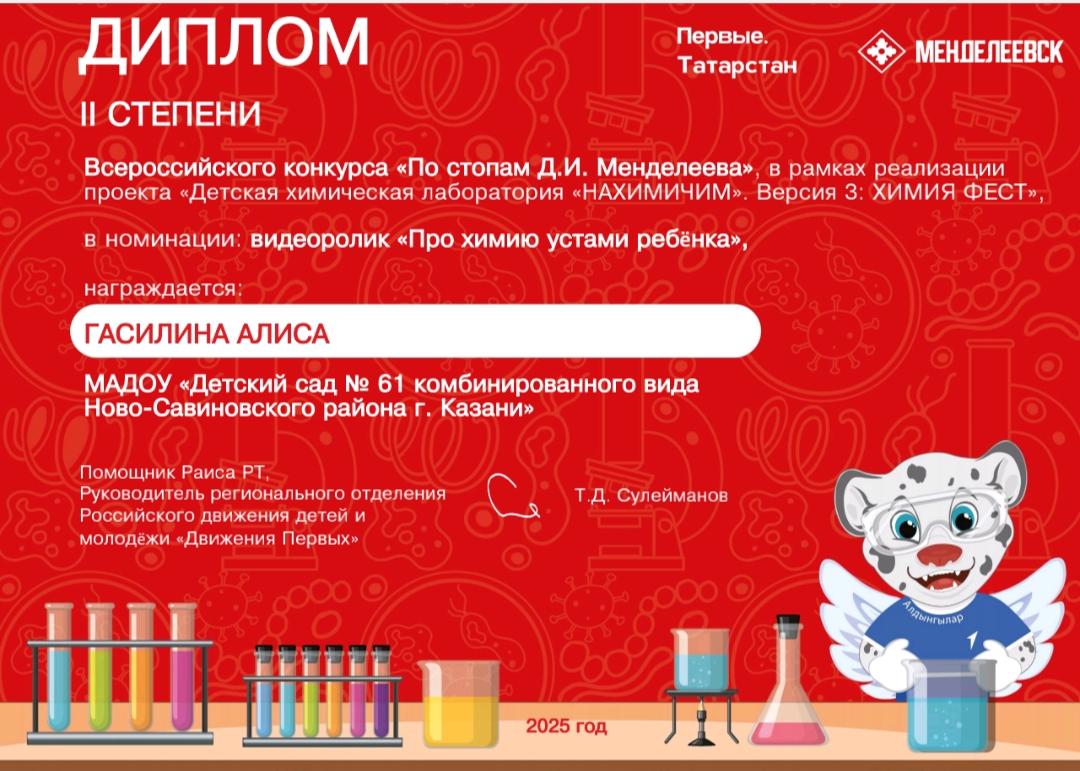Наши талантливые юные химики одержали блестящую победу на Всероссийском конкурсе «По стопам Менделеева», завоевав второе призовое место. Это выдающееся достижение стало возможным благодаря упорству и стараниям воспитанников нашей детской химической лаборатории «НАХИМИЧИМ», работающей совместно с проектом «Движение первых». Такой успех служит ярким примером стремления юных исследователей к познанию химии и открывает перед ними новые горизонты научных открытий