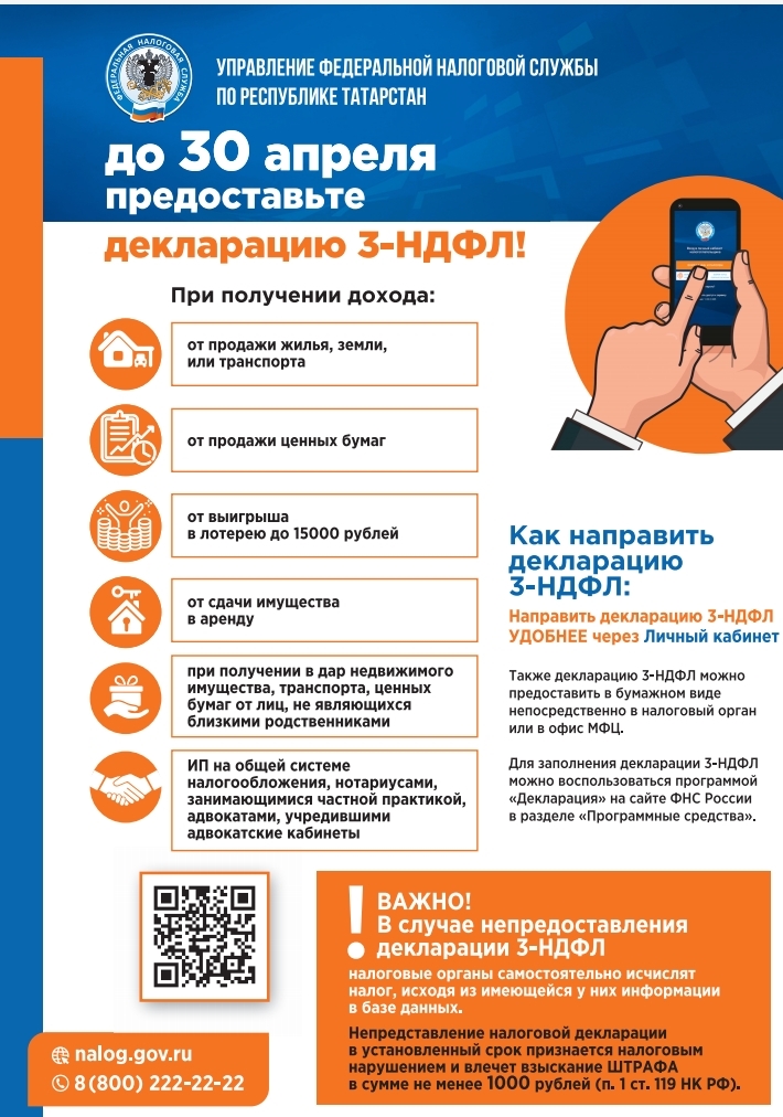 ВНИМАНИЕ!!!!! УФНС России по Республике Татарстан в целях информирования широкого круга лиц направляет информационную листовку «До 30 апреля предоставьте декларацию 3-НДФЛ» 16.02.2022