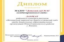 Наш детский сад награжден дипломом Лауреата районного конкурса "Безопасный переход по дороге в детский сад" среди дошкольных образовательных учреждений Ново - Савиновского района г. Казани, организованный ГБУ "Безопасность дорожного движения" г. Казани 01.12.2020