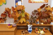 С приходом сентября, в изостудии детского сада прошло осеннее оформление, для лучшего восприятия детьми этого времени года. На стене и столе появились красивые ветки клёна и шиповника, грибочки, поделки из ткани и шерсти, ароматные яблочки и груши.
