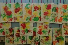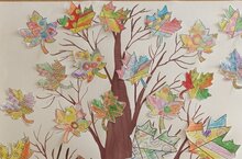 В разновозрастной группе №9 выполнена коллективная работа "Художница -Осень". Работа проведена в два этапа, сначала дети раскрасили кленовые листочки, потом вырезали и приклеили на подготовленный фон. Всё листочки получились разными и очень красочными.