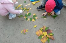 Цветом листья разные: желтые и красные.Ребята младшей группы № 13 занимаются настоящим творчеством на улице- изучают листики и составляют из них красивые картинки.
