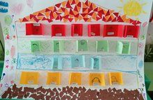 Ребята подготовительной к школе группы № 9 сделали коллективную работу «Наша группа», на которой изобразили группу в виде дома. В этом доме 4 этажа: первый - осенний, там "поселились" те дети, у кого день рождения осенью; второй этаж - зимний, для тех детей, кто родился зимой; третий - весенний, четвёртый - летний. Дети с удовольствием создавали коллективную композицию из отдельно подготовленных деталей.