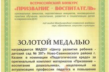 Награждается МАДОУ «Детский сад № 397» золотой медалью всероссийского конкурса «ПРИЗВАНИЕ – ВОСПИТАТЕЛЬ» в номинации «Педагогическое кредо» за оригинальный комплект материалов «Призвание – воспитание дошкольника», нацеленный на актуализацию профессии педагога и повышение его авторитета в общественном сознании. Так держать!!!