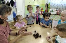 С древних времен на русской земле детей забавляли шишками, чурочками, желудями, орехами, косточками, камушками и прочим природным материалом. Из него строили, делали игрушки, выкладывали узоры, перебрасывали, перекатывали друг другу и т. д. Колючие шишки, гладкие блестящие желуди, кора деревьев своим ароматом, влажностью, шероховатостью, теплой энергетикой вызывают положительные эмоции, дарят рукам силу, гибкость, свободу движений. Игры с природным материалом помогают адаптировать малышей к условиям детского сада. Ребенок увлеченно рассматривает, ощупывает, перекладывает из руки в руку, познает мир! В процессе тактильного общения с природным материалом малыш успокаивается, его страхи и тревожность уходят, он идет на контакт с педагогом и сверстниками. Играя с природным материалом, малыши первой младшей группы №2 познают окружающий мир, становятся общительнее, спокойнее. Так же развивается мелкая моторика, процесс оказывается увлекательными неутомительным делом, благодаря которому рука постепенно крепнет, становится более подвижной, готовой выполнять более сложные действия.