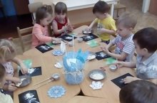 "Прямо с неба к нам летят лёгкие пушинки, серебрятся и блестят белые снежинки." В младшей группе сегодня дети рисовали снежинки, используя нетрадиционную технику рисования (клей и манная крупа). Рисование снежинок манной крупой - простое и увлекательное занятие. Каждому ребёнку хочется порадовать своих близких поделкой, выполненной при помощи нетрадиционной техники искусства. И детям было радостно от создания тонкого и изящного изображения.