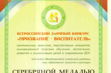 Детский сад награжден серебряной медалью Всероссийского конкурса "Призвание -воспитатель" за комплект материалов "Взаимодейцтсвие семьи и детского сада в современных условиях", отражающих особенности вовлечения родительской общественности в образовательный процесс (авторы - Нурлыгаянова Г.Ф., Валиева А.Р.)