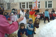 Гости дорогие, к нам на праздник поспешите!С нами спойте и спляшите! Будет праздник здесь большой –Встретится Зима с Весной. Зиму с песнями проводим,Спляшем с нею в хороводе! А Весну весельем встретим,Словом ласковым приветим! -