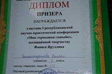 Ученица 9 "б" класса Замальтдинова Диляра стала призером Республиканкой конференции им.Ф.Яруллина