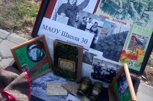 В течение недели ученики нашей школы собирали военную, памятную атрубутику. Были представлены настоящий солдатский биноколь, фляжка, каска, буденовка, письма-треуголки, пришедшие с фронта; фронтовой дневник-спутник солдата, медали и ордена ветеранов ВОВ- прадедушек учеников нашей школы.