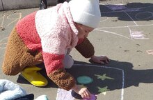 Мы полетим с тобой на ракете! Ребята начальной школы рисуют на асфальте в честь Дня космонавтики.
