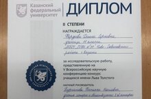 Поздравляем Фардееву Диану, ученицу 11 класса(науч.рук.Бурганова Т.Н.), со 2 местом во Всероссийской научной конференции-конкурсе учащихся им.Льва Толстого. Молодец!