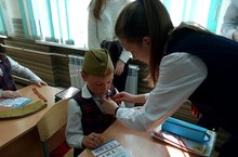 Георгиевская ленточка символ мужества и отваги наших солдат! Ребята из 10а класса провели акцию "Георгиевская ленточка". Они рассказали ученикам 2б класса об истории ленты, ее значении и раздали малышам георгивские ленты и буклет о том, как правильно ее носить.