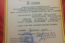 Хуснуллина Диляра из 3Б класса получила диплом III степени в VII Всероссийской научно-исследовательской конференции школьников «По следам Абдуллы Алиша. Из 248 сказок её сказка заняла 3 место! Талант растёт
