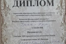 Залялютдинова Руслана ученица 3А класса получила диплом 3 степени на XIII городской научно-исследовательской конференции им. Д.С. Лихачёва, науч.рук. Гильмизянова М.Г.
