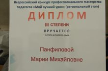 27 октября прошел Всероссийский конкурс педагоического мастерства педагогов "Мой лучший урок"(региональный этап). Панфилова Мария Михайловна, учитель английского языка, получила диплом 3 степени. Поздравляем!