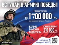 Вступай в армию победы! Ведется набор на военную службу по контракту. Единовременная выплата до 1,5 млн.рублей при заключении контракта до 31 июля. Зарплата от 210 тыс.рублей. Номер телефона для связи +7(843)223-19-00 (доб.86207) 11.07.2024