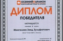 Администрация школы поздравляет ученика 9а класса Мингалиева Заида, ставшего победителем во Всероссийском турнире по истории «Осенний марафон»