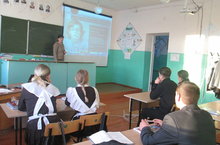 Учитель с помощью мультимедийного пректора рассказал про поисковую работу Валиуллина Тахира Анваровича, выпускник нашей школы, член поискового отряда "Нефтехимик".