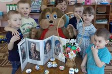 В этот день к ребятам в гости заглянул Мишка косолапый, вместе с ним, ребята отправились в увлекательный космический мир. Сначала они посмотрели фильм о космосе, старшие ребята рассказывали Мишке о космонавтах, которых уже знают, построили из строительного материала большую ракету, поиграли в игры, а в завершении праздника, изготовили для Миши крашенки своими руками.