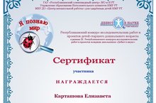 Награждение Карташовой Елизаветы 15.01.2018 В Республиканском конкурсе исследовательских работ и проектов детей старшего дошкольного возраста в рамках IX Республиканского конкурса "Дебют в науке", награждается воспитанница детского сада "Теремок", Карташова Елизавета, за исследовательскую работу в секции "Зеленая планета". Руководитель: Сулейманова Рамиля Хасанзановна.