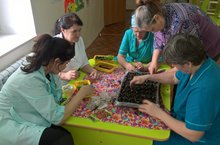 Сотрудницы детского сада пересаживают цветы для оформления клумб.