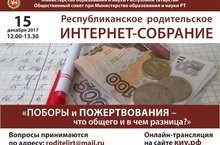 Новый проект Минобрнауки РТ – республиканское родительское интернет-собрание - стартовал 17 ноября, когда состоялось первое такое собрание. По словам замминистра образования и науки РТ Ларисы Сулимы, заседания родительских собраний в форме интернет-конференций планируется проводить раз в месяц. На первом мероприятии «Как учить, а не мучить?» обсуждали ресурсы семьи в адаптации ребенка к школе и мотивации его к обучению.Тема собрания 15 декабря - "Поборы и пожертвования: что общего и в чём разница?" На собрании 19 января и 16 февраля 2018 года будет рассматриваться роль родителей в обеспечении информационной безопасности детей; 23 марта – значение семьи в формировании жизненных целей и профессиональном самоопределении подростков;10 апреля – эффективные методики подготовки детей и подростков к аттестации знаний; 18 мая – методики преодоления конфликтных и кризисных ситуаций в жизни детей и т.д. Каждый месяц с 12.00, в период обеденного перерыва, родители могут посмотреть видеотрансляцию из любой точки и послушать советы экспертов.