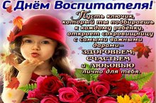 Поздравляю с Днём воспитателя и всех дошкольных работников! Пусть в любимом детском саду всегда будет прекрасная погода, пусть проливаются дождики радости, пусть светит солнышко счастья, пусть сияет радуга веселья, пусть и в Вашей жизни каждый день будет удивительным, наполнен светлыми чувствами и положительными эмоциями. Здоровья Вам, детской непосредственности души и вдохновения доброго сердца. 27.09.2020