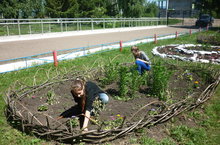 Прополка клумб участниками летнего -трудового лагеря.