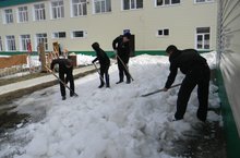 Сегодня в нашей школе прошёл субботник. Сотрудники и учащиеся школы очистили территорию от мусора и раскидали снег.