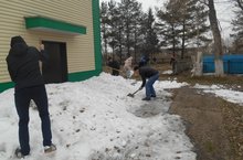Учащиеся и сотрудники школы раскидывают снег, лежащий в тени, для скорейшего таяния.