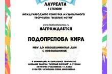 Подопрелова Кира ученица муз отделения, класса фортепиано участвовала в Международном конкурсе музыкального творчества «Веселые нотки», и была награждена дипломом I степени.