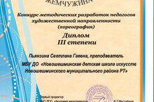 Преподаватель хореографического отделения Пьянзина С.Г. приняла участие в Республиканском конкурсе методических разработок педагогов художественной направленности (хореография) "Жемчужина" и получила Диплом III степени за работу "Адажио в классическом танце"