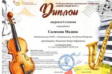 Ученица музыкального отделения Салихова Мадина приняла участие в IX Всероссийской олимпиаде по сольфеджио "Квинтовый круг" и получила Диплом Лауреата I степени в первой возрастной группе. Педагог Маланчева В.Р. отмечена Благодарственным письмом оргкомитета олимпиады. Поздравляем Мадину и ее педагога Венеру Рафкатовну с отличным достижением и желаем творческих успехов!
