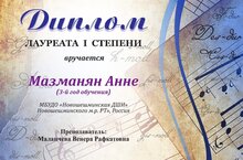 Ученица музыкального отделения класса фортепиано Мазманян Анна (3 год обучения) приняла участие в международной олимпиаде по сольфеджио и получила Диплом Лауреата I степени. Педагог по теории музыки Маланчева В.Р. отмечена Благодарственным письмом за высокое педагогическое мастерство, проявленное при подготовке лауреата конкурса. Поздравляем Анну и Венеру Рафкатовну с отличным результатом, гордимся и желаем творческих успехов!