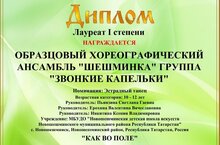 Образцовый хореографический ансамбль "Шешминка" группа "Звонкие капельки" принял участие в IV Всероссийском конкурсе "Самородки России" г. Волгоград и получил в номинации "эстрадный танец" Диплом Лауреата I степени за исполнение танца "Как во поле..." Поздравляем ансамбль и его педагогов Пьянзину С.Г., Ерохину В.В. и Никитину К.В. с отличным результатом и желаем творческих успехов!