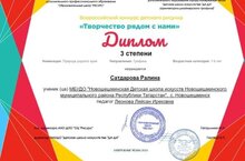 Ученица художественного отделения Сатдарова Ралина приняла участие во всероссийском конкурсе "Творчество рядом с нами" по направлению графика и получила Диплом 3 степени. Педагог Леонова Л.И. Поздравляем Ралину и ее педагога Лейсан Ирековну с отличным результатом и желаем творческих успехов!