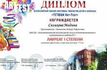 Ученица музыкального отделения класса фортепиано Салихова Мадина приняла участие во Всероссийском конкурсе-фестивале творчества детей и взрослых "Тетюши Art Fest" и получила Диплом Лауреата I степени в номинации фортепиано, возрастная категория 7-9 лет. Поздравляем Мадину и ее педагога Маланчеву В.Р. с отличным достижением ижелаем им дальнейших успехов!