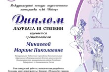 Преподаватель ммузыкального отделения по классу баяна и аккордеона Минаева М.Н. приняла участие в международном конкурсе педагогического мастерства Art Victory" и получила Диплом Лауреата III степени в номинации методические разработки с конкурсной работой: Концерт "Музыка без границ". Поздравляем Марину Николаевну с победой и желаем ей тврческих успехов!.
