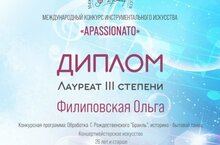 Концертмейстер хореографического отделения Филиповская О.Н. приняла участие в Международном конкурсе инструментального искусства "APASSIONATO" и получила Диплом Лауреата III степени в номинации "Концертмейстерское искусство" обработка Г.Рождественского "Бранль" историко - бытовой танец. Поздравляем Ольгу Николаевну с отличным творческим успехом и желаем ей дальнейших побед!