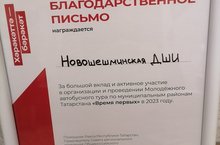 Детской школе искусств вручено Благодарственное письмо за большой вклад и активное участие в организации и проведении Молодежного автобусного тура по муниципальным районам Татарстана "Время первых" в 2023 году. Письмо подписано Помощником Раиса Республики Татарстан, Председателем Совета регионального отделения Общероссийского общественного государственного движения детей и молодежи "Движение Первых Республики Татарстан" Сулеймановым Т.Д.
